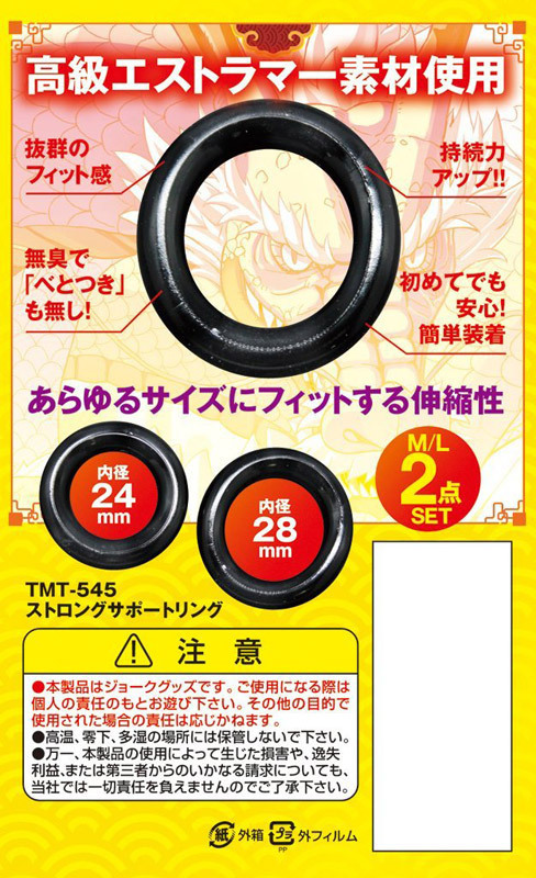 φ24mmとφ28mmの2個入り!装飾無し、シンプルで使いやすい黒いエラストマー製コックリング。 フィット感よし!ペニスの根元を締め付け、早漏予防や勃起補助として使うコックリングです。 海綿体に血液を留めて早々に果てるのを防ぎながら、いつもより勃起をキープして感度も上げる優れもの!ベトツキが少なく伸縮性に富み、装着も簡単。 イザという時の男の味方です。 ●メーカー型番:TMT-545