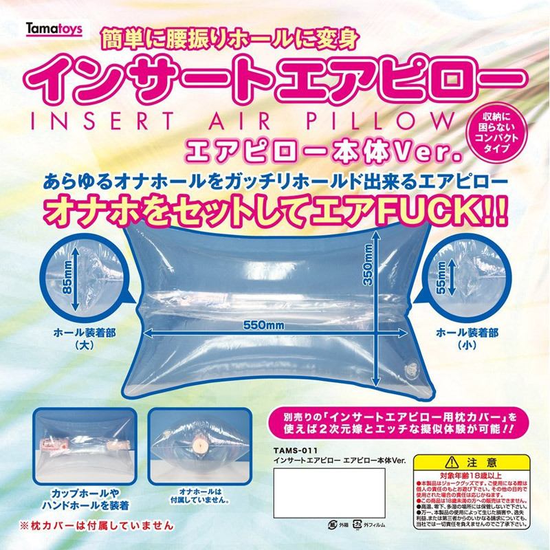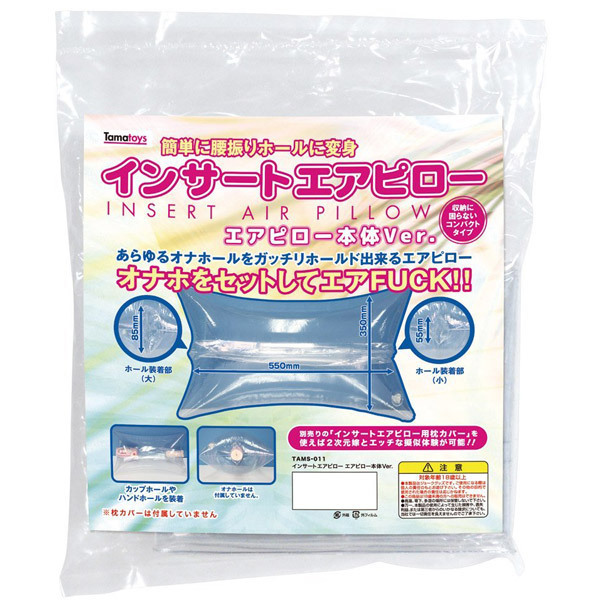 お手持ちのオナホールをセットするだけで、簡単に腰振りオナニーが出来るタマトイズのエアピロー。 ●大小二つの挿入穴を本体上下に配置●本体サイズ:55cm×35cm●ホール装着穴(大):8.5cm●ホール装着穴(小):5.5cm●保管にも便利なコンパクトタイプ。 カップホールやハンドホールなど様々なサイズに対応可能。 別売りの「インサートエアピロー用枕カバー」を装着すれば、二次元嫁とのリアルな疑似H体験が楽しめます。 ●メーカー型番:TAMS-011 ※オナホール、枕カバーは付属しておりません