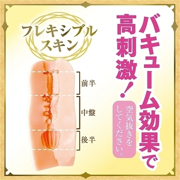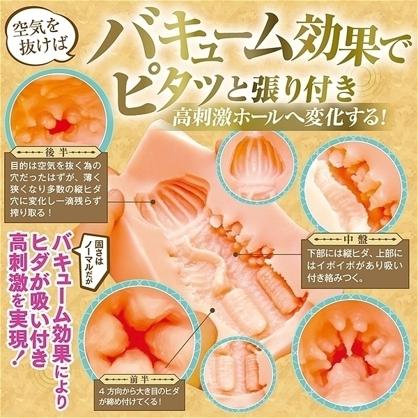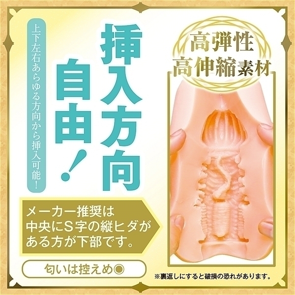 日本製、国内自社工場製。 エルフの名器はバキューム特化!4方向から大き目のヒダが締め付けてくる!下部には縦ヒダ、上部にはイボイボがあり吸い付き絡みつく。 空気を抜けばバキューム効果でピタッと張り付き感触が変化する!挿入方向自由!左右上下あらゆる方向から使用可能(メーカー推奨は中央にS字の縦ヒダがある方が下部です)。 フレキシブルスキン、高弾性・高伸縮素材、匂い控えめ、非貫通型オナホール、ローション付き