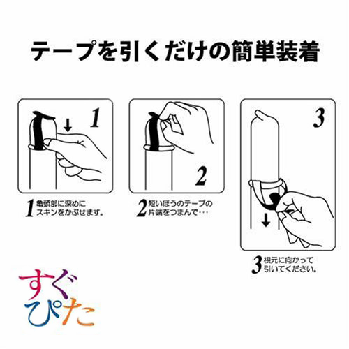 テープを引くだけ!簡単にスピード装着が出来るお手軽コンドーム「すぐぴた2000」12個入。 コンドームの装着時に裏表が分かりにくい…空気がうまく抜けなくて何度も装着しているうちに一個無駄にしてしまった…爪がうっかり当たって使用する前から破けてしまった…そんな経験ありませんか?「すぐぴた」ならすぐに装着出来て、ぴたっとフィット!粒状凸起付きのフィット加工が気持ちいいコンドームです。