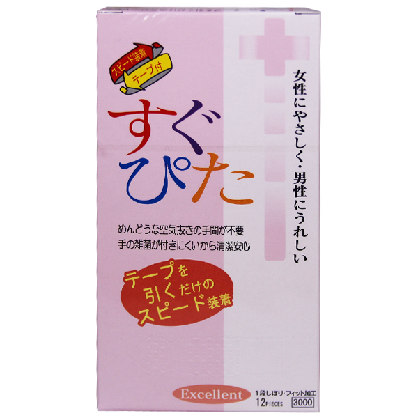 一度使ったらやめられない!テープを引くだけで簡単に装着できる、スピード装着テープ付きコンドーム「すぐぴた3000」12個入。 空気がうまく抜けなくて何度も装着してるうちに一個無駄にしてしまった、爪がうっかり当たって使用する前から破けてしまった、そんな経験はありませんか?「すぐぴた3000」なら、そんなお手間は取らせません。 特殊一段緊縮絞りが脱落防止に効く、ツブ突起付きコンドームです。