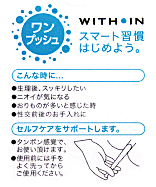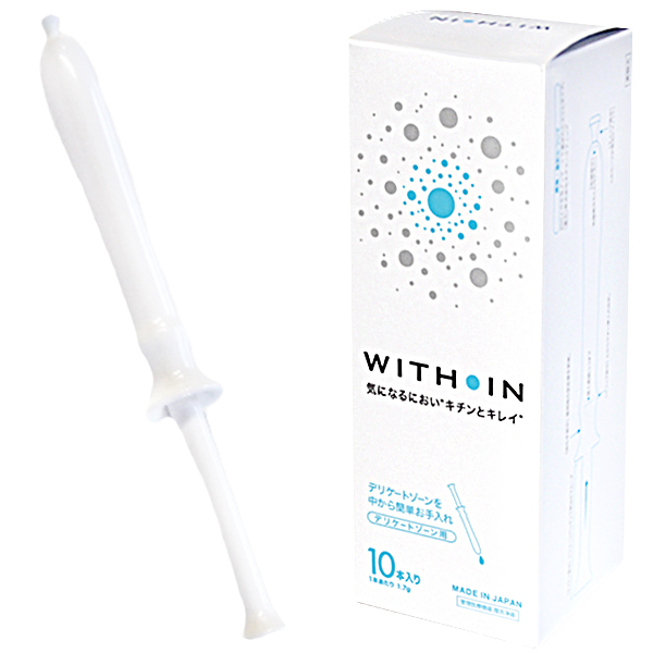 手を汚さず衛生的!ワンプッシュで膣内を洗浄できる、日本製の使い切り膣洗浄器10本入り。 性交前後のお手入れや、生理やオリモノなどの気になるニオイに♪デリケートゾーンを内側から洗浄します。 安心成分だけを厳選し、使用感はとってもナチュラル◎スリムタイプなので挿入が苦手な人でも安心!ウィズインで膣ケアをして日頃の不快感から解放されよう♪管理医療機器