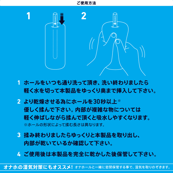 オナホを洗った後に挿しこんで揉むだけで速乾燥。 『G PROJECT HOLE QUICK DRY 珪藻土STICK』は、挿し込んだ瞬間から棒状の珪藻土が水をしっかり吸収して乾燥させる!今まで奥の乾燥が難しかった大型ホールにも対応していて、オナホと一緒に密封保管する事で、湿気を取り除いてくれたりといった効果も期待できます。 驚きの吸水力と速乾力に優れた本製品を是非お試しください!