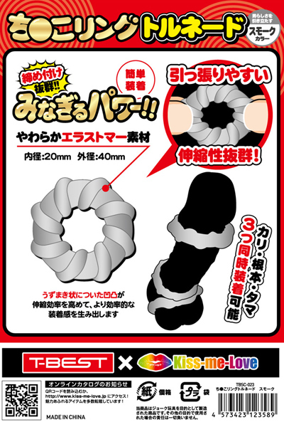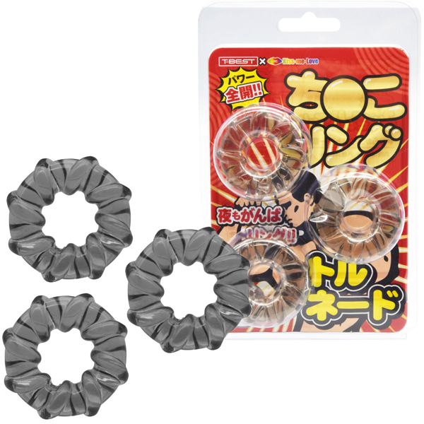 <T-BEST×KISS-ME-LOVE>夜もがんばリングで大人気のやわらかメンズリング「ち●こリング」が、トルネードになって新登場!今度のち●こリングは「特殊形状3個セット」!トルネードデザインのリングを3つもセットにしました!うずまき状に巻き付いた凹凸が伸縮率を高めてより効率的な装着感を生み出します。 合わせて使えば三点同時装着が可能となります!高い耐久性のやわらかエラストマー素材に引っ張りやすい簡単装着デザイン男らしさを引き立たせるスモークカラー!締め付け抜群みなぎるパワー!