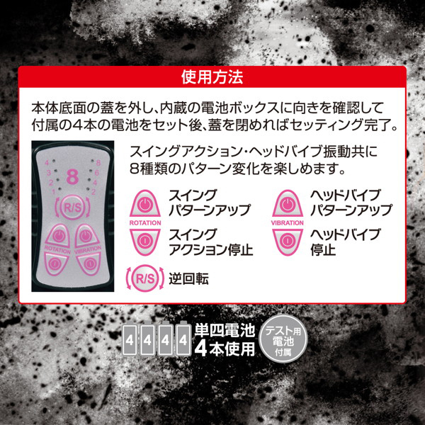 中イキ好きに!6Vの激震でGスポを責め立てる高性能モーター内蔵の電池式バイブ(黒)。 8種類の振動&スイングと刺激の変化をもたらすリバース機能など多彩なアクション搭載!挿入可能長153mmのストレートボディが内部をかき回し、ヘッドバイブでGスポを徹底的に刺激する♪止まらぬ快感に病みつきになること間違いなし!滑らかで柔らかな特殊ラバー素材使用。 単4電池×4本使用
