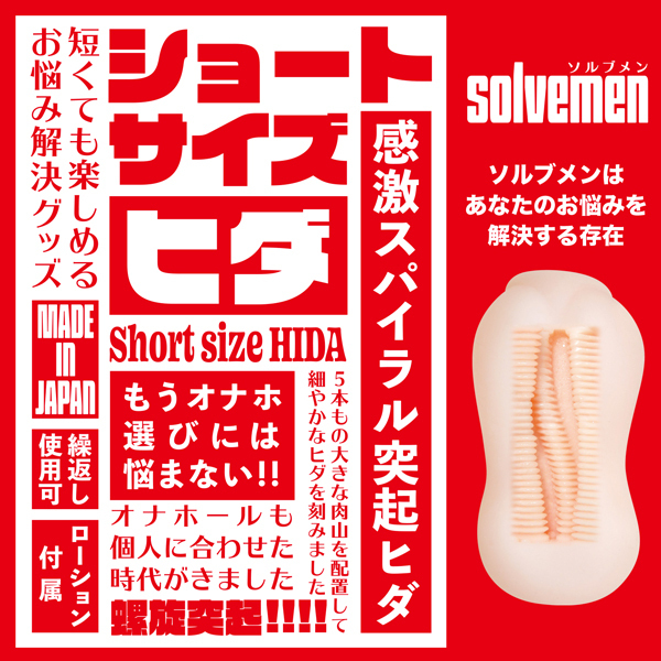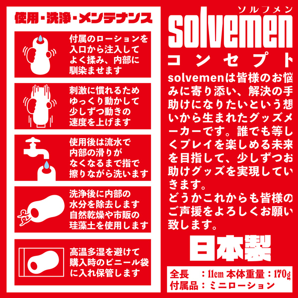 突起ヒダが螺旋状に続くスパイラル構造!全長11cm、繰り返し使えるショートサイズの日本製オナホ(非貫通)♪全ての人のお悩みに寄り添い解決したいという思いから開発された「ソルブメン」。 短い人も長い人も楽しめるように2種類のタイプをご用意!「どれを選んでいいか分からない」というお悩みを、このソルブメンが解決します。 ミニローション付