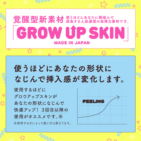 高い伸縮性&耐久性を誇る覚醒型新素材「GROW UP SKIN」採用!肉厚300g、ギュっと締め付け絡みつく非貫通オナホ。 張り巡らされたヒダと押し合うイボのプレスで極上快感!使えば使うほど肌に馴染み成長する人肌感触の高弾力スキン仕様で、特に3回目以降はより気持ちいい挿入感を味わえます♪パッケージは「すーぱーぞんび」氏◎日本製、収納袋&ローション付属