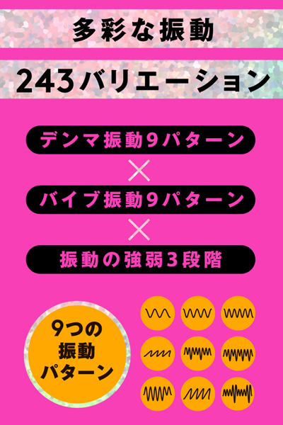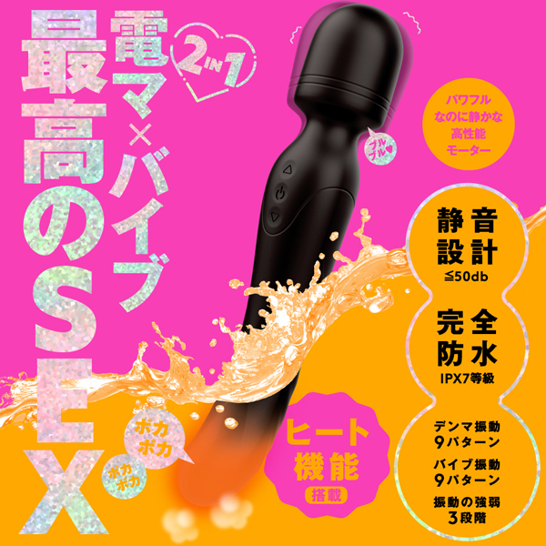 最強の電マ×最強のバイブ!2in1の超万能アイテムで最高のSEX。 様々な女性の好みに合わせた9種の振動パターン&強弱3段階はソフトタッチな繊細振動からパワフル振動まで多彩な振動バリエーション!バイブ側にはヒート機能を搭載しています。 幸せ温感と高品質ソフトシリコンの感触も相まってリアルな人肌感覚はまさにポカポカあったかホンモノSEX!【完全防水IPX7等級】水での故障を軽減。 使用前後にそのまま水洗いもでき衛生面にもこだわっています。 パワフルなのに静かな高性能モーターを搭載。 周りを気にせずにお楽しみいただけます。