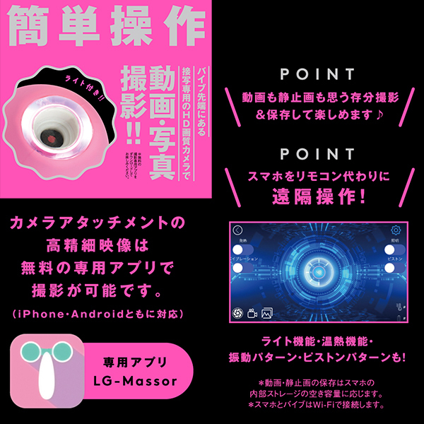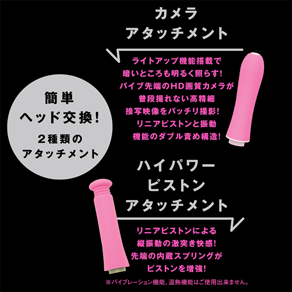 あの娘のナカや奥まで見えちゃう♪バイブの先端にアソコを接写できるHD画質カメラを搭載した高機能なバイブ「CAMERA PISTON VIBE 90(カメラピストンバイブ90)」です。 ライトアップ機能がついたアタッチメントで動画撮影や写真撮影も楽しめる!パートナーのあそこのナカを見たい欲求を満たしてくれるとともに、温感を楽しめるバイブとしても優秀なのでハイパワーピストンとリニア式のピストンアクションで極上の快感を体験できます♪お好みのリズムで感じられる9パターンのバイブ振動にリニア振動による重厚な奥突きピストン10パターン!高品質シリコン仕様でやさしい肌触りを確かめながら、温熱機能搭載で人肌感覚のぬくもりもお楽しみ頂けます。 2種類のアタッチメントで簡単ヘッド交換、飽きのない充実機能!本体は充電式で充電時間約210分。 最大連続稼働時間約70分(初期振動パターン未変更時)です。 生活防水機能付き。 付属品はアタッチメント、USBプラグ式充電コード。