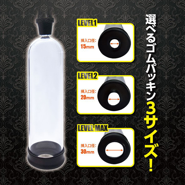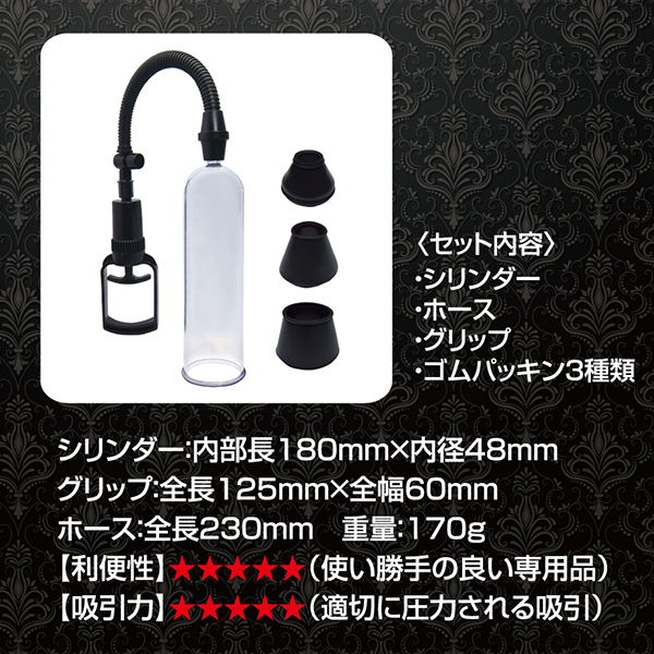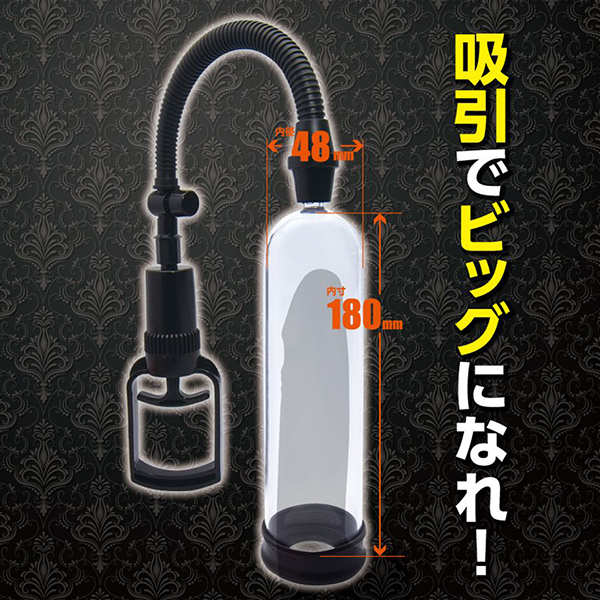 吸引でビッグになれ!強い男になるために開発された増大ポンプ「BIGBOY PUMP(ビッグボーイポンプ)」が新登場!簡単に片手で握れるトリガーレバーにワンプッシュの圧力開放ボタン、さらには大きさが目で分かる透明シリンダー、サイズが選べる3種類のゴムパッキンと操作性や視認性も抜群♪必要なものがすべて揃っていて、あとはレバーを握って空気を吸って、吸引圧力でメンズをビッグにするだけ!トリガーレバーは手動式なので微細な調整もコントロールも簡単♪圧力開放ボタンは安心設計でワンプッシュで吸引キャンセル!シリンダーは憧れサイズにぴったりな内寸長180ミリ×内径48ミリとなっています。 挿入口のゴムパッキンは、選べる3サイズ(15ミリ、20ミリ、30ミリ)!シンプルながらもじっくり増大を計画しているならおすすめです♪