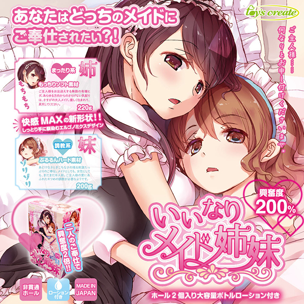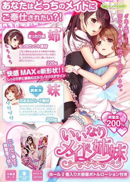 ホール2個入り!大容量ボトルローション付き(姉)もっちりソフト素材。 ご主人様をお出迎えする無数の有機ヒダ。 あらゆる方向からのさりげない気配りはさすがの大人メイド。 優しく包まれて昇天してください。 (妹)ぷるるんハード素材。 あどけなさとぎこちなさの残る刺激たっぷりのご奉仕。 メイドとしても女性としてもまだまだ半人前。 ご主人様の愛にあふれたキツめの調教が必要なようです。