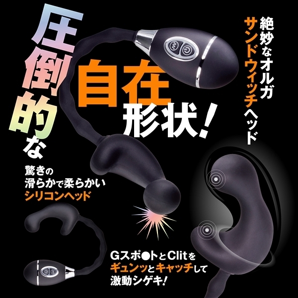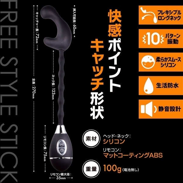 長いネックが自在に曲がって楽しめるフレキシブルネックローター。 先端はこだわりのオルガサンドウィッチ形状で快感部分をしっかりキャッチします。 高品質シリコン素材採用の先端がGとClitをしっかりダブル刺激。 しっかり楽しめる10パターン振動にプレイの邪魔をしない静音設計。 生活防水。 グイグイ責めれるスティックGローター!