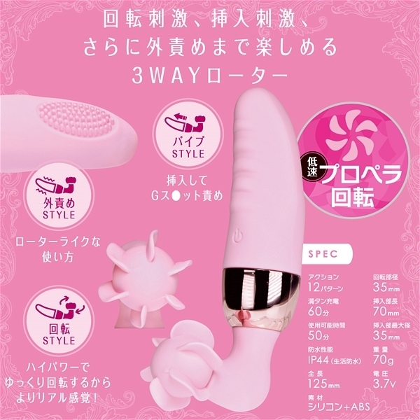 低速プロペラ回転&絶妙振動の2つのギミックが個別に楽しめるデュアレディ最新作。 心地良い低速での回転がリアルな舌の感覚を再現したヘッドの反対側にはハイパワーの高性能モーター振動で外責め・挿入のどちらも楽しめる形状のバイブレーターヘッド。 2つの形状で3種類の楽しみ方が出来ます。 素材は肌触りの良い滑らかな高品質シリコン採用。 プレイの邪魔をしない静音設計。 回転・振動・挿入が楽しめる3WAYローター。 60分充電で最大50分使用可能なリチウムイオンバッテリー内蔵(使用環境によって大幅に増減する可能性が御座います)。