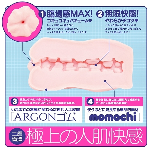 限りなく本物の肌と質感を追求した次世代人工皮膚素材を使用!いままでの常識が変わる次世代人工皮膚素材「ARGON(アルゴン)」を使用した非貫通オナホ「次世代HOLE XYZ 人工皮膚」です♪計算された内部構造にローションと空気の黄金比!極上の「ギュポギュポ」する吸い付きと挿れ心地は絶品です♪外層は柔らかいのにベタつかないさらっとした人肌再現の新素材を使用!内層は使うほどに成長する革命的素材「momochi」を使用することで、使えば使うほどにあなたに馴染んで成長するもっちり人肌感覚がたまりません♪劣化しずらい高い耐久性や弾力性も魅力的!2層構造が極上の人肌快感とキュッと締まった挿入口、そしてストロークの度にエッチなギュポ音を発する使用感が聴覚からもイキを誘発してくれそうです♪素材は安心の国産素材&国内生産。 パッケージイラストは人気絵師「ぴょん吉」氏を起用。