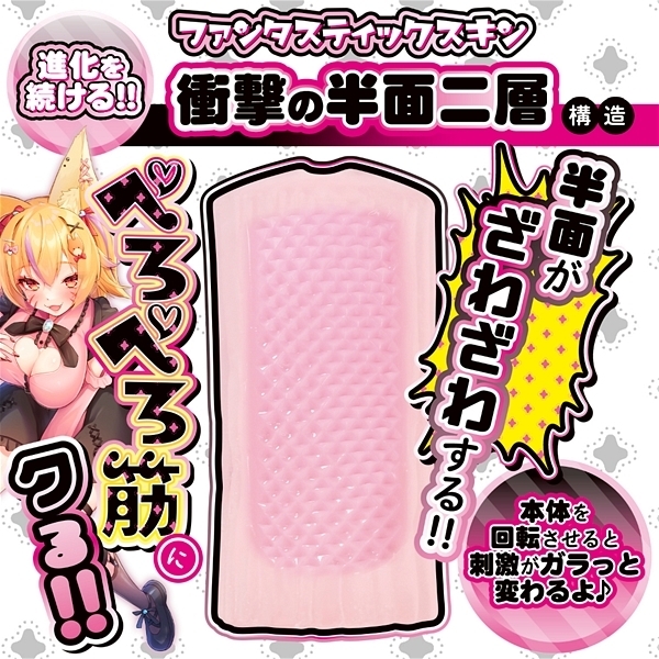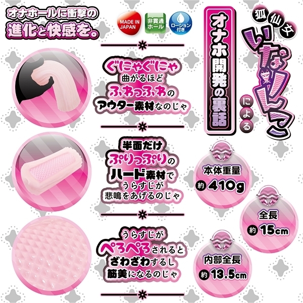 狐仙女による新たな刺客が届いた!!それが「半面二層!!ざわペロ筋美」である。 いなりんこは妖術と神力を使い分ける稀有な狐仙女の次女。 スケベな事が大好きで男性向け性的竹輪を研究する。 今回いなりんこは「ざわペロ」というコンセプトを得て新たな境地に達する。 ふわっふわのアウター素材で優しく柔かく包み込まれるのは最近の定番。 夢心地の気分から突然の刺激が襲ってくる二段構え!!このギャップがスゴイ!!なんと!!うら〇じが悲鳴をあげるほどの「ざわざわ」であり「じょりじょり」であり、しかし「ペロペロ」でもあるのだ。 それもそのはず。 「半面二層」というオリジナルギミックで、特にうら〇じを執拗に攻める仕様になっているのである。 果たして人間にこの摩訶不思議かつ強烈な使用感が理解できるのか…?「そのうら〇じ、ざわざわペロペロさせてもらうのじゃ!」