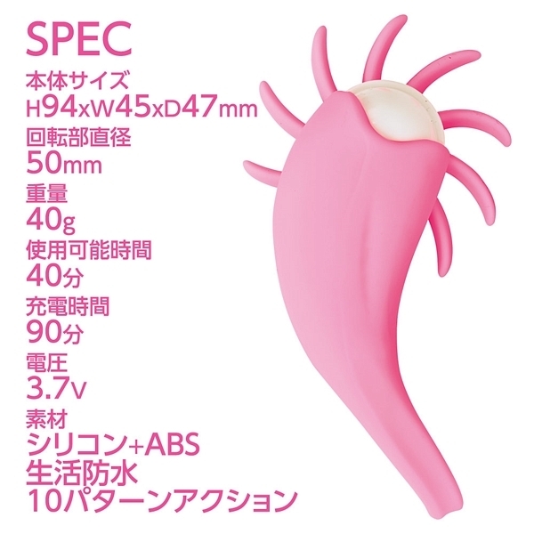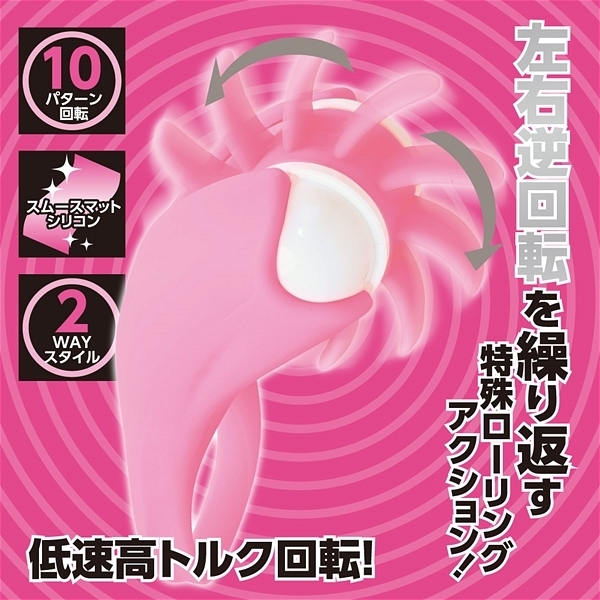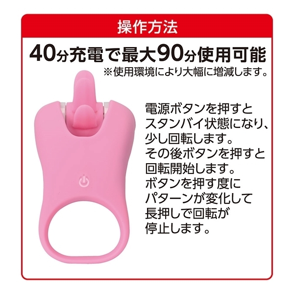 左右逆回転を繰り返す特殊ローリングアクション機能のリング登場。 よりリアルな低速回転アクションをハイパワーモーターで実現。 指にはめたり、リングとして着用してク○や乳首を刺激!リバース回転を繰り返す動きを含む10パターンアクション。 リチウムイオン電池搭載で90分で満充電・最大40分使用可能(使用環境により大幅に増減します)。 生活防水性能。 リング部は肌触りの良いシリコン素材採用●カラー:ピンク