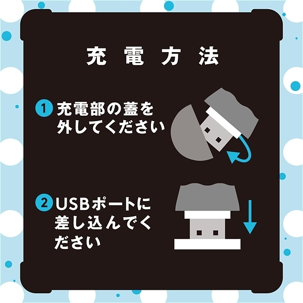 パッケージ:16.3×13.2×7.9cm 本体:19.9×3.8×4.8cm 重量:64g USB充電式
