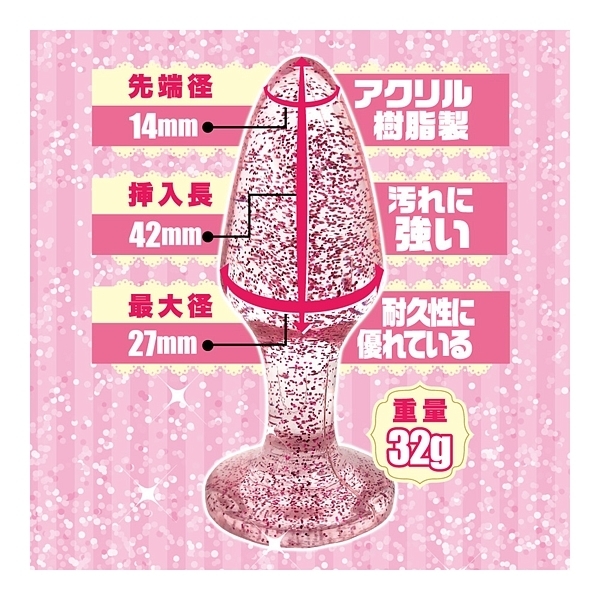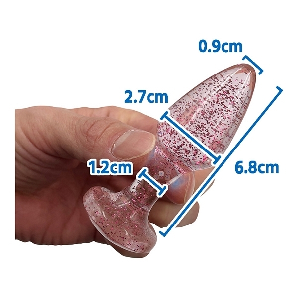 ラメ入りがとってもキュートなキラキラ系アダルトグッズ、「ラメ入りア●ルプラグ」!気分はまるでパーティー♪透明ボディの中には、キラキラのラメがみっちり入りました。 眺めているだけで楽しくなる可愛いアイテムです。 本体素材には、魅力を高めるアクリル樹脂を使用しました。 アクリル樹脂はガラスのような透明さをもちながらも優れた耐衝撃性で割れにくいのが特徴です。 耐水性もあるので水や汚れに強くメンテンナスの簡単さもポイント。 さらにはカチカチの高硬度タイプ。 柔らかいア●ルプラグには無い自己主張の激しい刺激にきっと魅了されるはず。 キュートな見た目とは裏腹にハードなア●ルプレイをお楽しみください。 「Sサイズ」は、全長82ミリに太さ27ミリのミニサイズ。 ビギナーの方や、低刺激で快感に慣れたい方などにオススメです。
