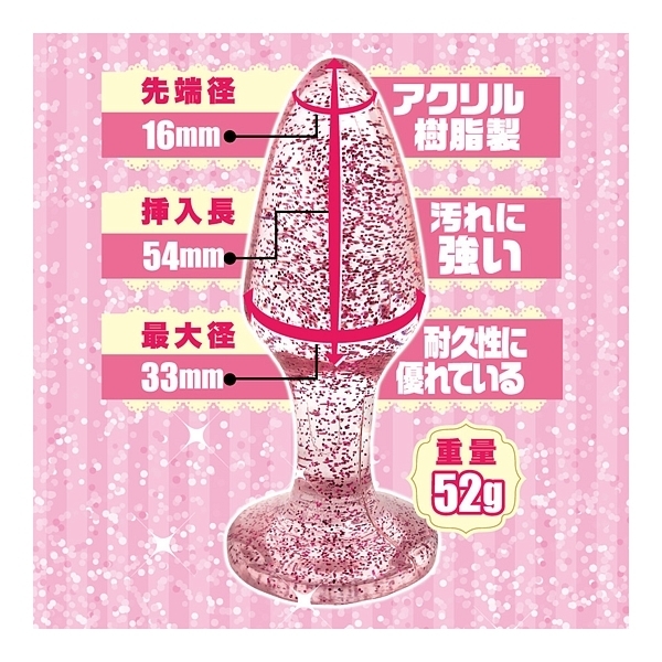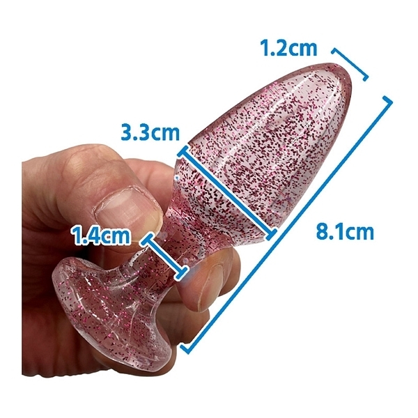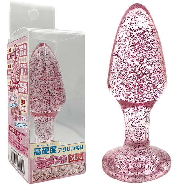 ラメ入りがとってもキュートなキラキラ系アダルトグッズ、「ラメ入りア●ルプラグ」!気分はまるでパーティー♪透明ボディの中には、キラキラのラメがみっちり入りました。 眺めているだけで楽しくなる可愛いアイテムです。 本体素材には、魅力を高めるアクリル樹脂を使用しました。 アクリル樹脂はガラスのような透明さをもちながらも優れた耐衝撃性で割れにくいのが特徴です。 耐水性もあるので水や汚れに強くメンテンナスの簡単さもポイント。 さらにはカチカチの高硬度タイプ。 柔らかいア●ルプラグには無い自己主張の激しい刺激にきっと魅了されるはず。 キュートな見た目とは裏腹にハードなア●ルプレイをお楽しみください。 「Mサイズ」は、全長94ミリに太さ32ミリのミドルサイズ。 ステップアップを目指す方や、拡張に挑戦したい方などにオススメです。
