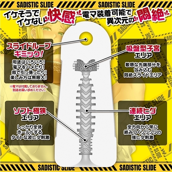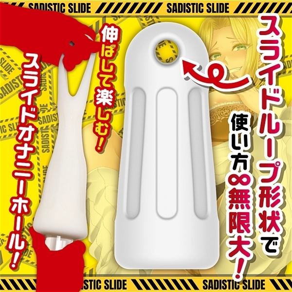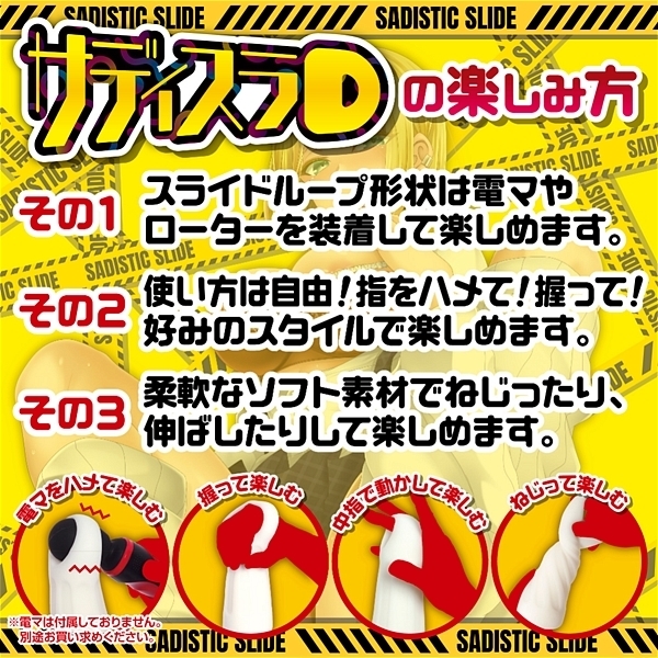 先端を刺激するギミックホール「サディスラD」は伸ばして楽しむスライドオナニーが楽しめるオナホールです。 電マやローターを装着できるオナホールが欲しい!オナホールを伸ばして刺激したい。 という新しい想像から「サディスラD」は開発されました。 上部に空いている「スライドループギミック」は電マやローターをハメたり、引っ張ったり、握ったり、ねじったりと、いろいろな楽しみ方で遊べます。 「電マ」「大型ローター」を装着することにより、他では味わえない「先端を直撃する強力な振動」で「イケそうでイケない状態」【悶絶】を味わえます。 根本をおさえて伸ばして楽しむ「スライドオナニー」やねじって楽しむ「スクリューオナニー」などオナホール本体の「形状変化」に取り組んだ「新しいスライドオナニー」をお楽しみください。 非貫通オナホール、ソフト素材使用。 保管に便利なブリスターケース付き、専用ローション付き。
