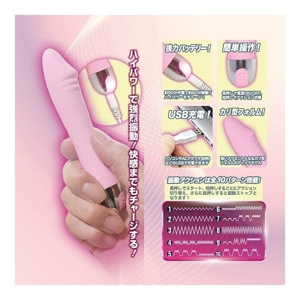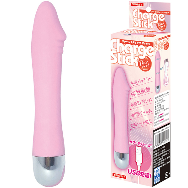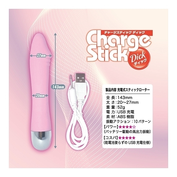 ハイパワー振動!コスパ最強!チャージ(充電)タイプのスティックトイが新登場!全長14センチとなる手のひらサイズの充電式スティックローターです。 乾電池要らずの充電バッテリー仕様なので、乾電池では実現できない高出力の強烈振動が楽しめます!さらに、振動アクションは全10パターン搭載。 ボタンを押すごとにアクションが切り替わりますので、お好みの振動アクションを見付けましょう!さらに、チャージ方法はUSB方式なので、モバイルバッテリーやPCなど様々な環境で充電可能。 乾電池要らずなのでコスパも抜群です。 初めての方にもオススメできる、小ぶりサイズの太さ27ミリ。 軽くて持ちやすい、重さ52グラム。 すべすべと肌ざわり良い、マット表面加工。 充電時間90分で、約60分間の連続稼働します。 「ディック」モデルは、先端に亀●が付いたメンズ型フォルム。 返し形状デザインで独特の刺激を楽しめます。 パワーもエネルギーも快感もチャージする、最新鋭のスティックローター!