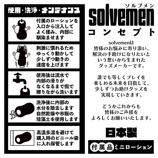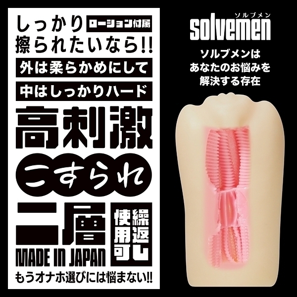 ソルブメンはあなたのお悩みを解決する存在です。 皆様はこのような話をご存知でしょうか?「オナホは同じ構造でも素材が変わると使用感が違う」はい大正解です。 それは真理です。 でも世の中は同じ構造かつ別素材のオナホを必ずしも発売してくれません。 それでは素材の違いによる使用感の変化を楽しむ事ができません。 そんな時こそsolvemenにお任せください!全く同じ構造ながら二層構造の内部素材を変えたものがコチラ。 「高刺激こすられ二層」と「低刺激ねっとり二層」になります。 見た目は同じなのにアラ不思議。 高刺激と低刺激を楽しめます。 まるで魔法のようにあなたの快感を惑わせる事でしょう。 素材だけではございません。 「絶頂刺激連続ヒダ突起構造」と名付けた特殊な内部構造をご覧ください。 どの素材でも一定の感度を担保する安定感の高い内部構造となっております。 あなたはオナホ選びに悩む必要はなくなります。 あなたのためにソルブメンがいるのです。 安心安全の日本製で繰り返し何度でも利用が可能です。 ●高刺激