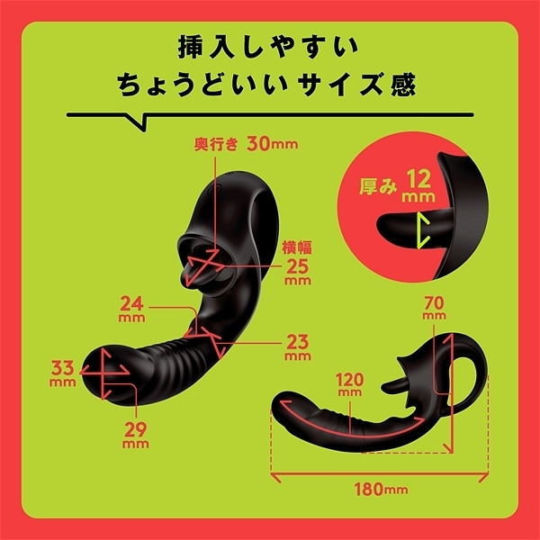 最強のバイブ×最強のクンニ!挿入しながらクンニされるという現実では難しいW絶頂パターン!舐めて舐めて舐め回す柔らかもっちり肉厚舌のとろけるクンニ!高品質ソフトシリコンを使用し、刺激が強すぎないように舌の先端をぷっくり丸くしているので、とても滑らかで優しい感触になっています。 挿入長120mm、最大径33MMで挿入しやすいちょうどいいサイズ感になっています。 重量約170gで長時間使用しても疲れない軽量設計になっています。 マンネリしない多彩な100バリエーション!繊細タッチな微振動からパワフル振動まで豊富な10パターンのバイブ刺激!強く押し付けても痛くなりにくい柔らかい肉厚舌のとろけるクンニ10パターン!静音設計≦60db。 防水機能IPX6等級 ※IPX6:放水ノズルを使って噴流水を最低3分間あてる試験(浸水は不可)