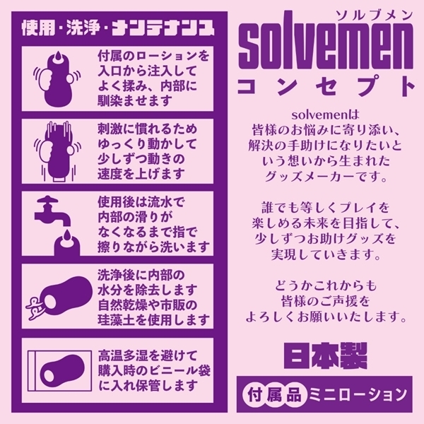 ソルブメンはあなたのお悩みを解決する存在です。 「同じ構造でも素材が違えばそこは別世界」「優しくねっとりかきわけたい」同じものを使い続けたいときもあれば、1日おきに違うものを使いたいときもある。 そんな気まぐれに全力で応えたいです。 それがソルブメンの生まれた意味だと思いませんか?今回のテーマは「優しくねっとりかきわけたい」となります。 今日は時間もあるしまったりしたい時に今回のテーマの「優しくねっとりかきわけたい」最適!それは間違いないのです。 あなたはオナホ選びに悩む必要はなくなります。 あなたのためにソルブメンがいるのです。 安心安全の日本製で繰り返し何度でも利用が可能です。