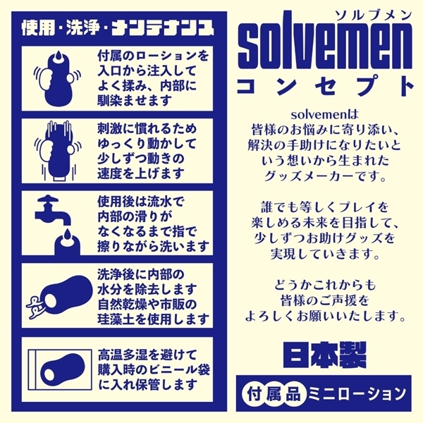 ソルブメンはあなたのお悩みを解決する存在です。 「同じ構造でも素材が違えばそこは別世界」「ゴリゴリ刺激的にこすりたい」同じものを使い続けたいときもあれば、1日おきに違うものを使いたいときもある。 そんな気まぐれに全力で応えたいです。 それがソルブメンの生まれた意味だと思いませんか?今回のテーマは「ゴリゴリ刺激」となります。 今日は少し何かもやもやしてるなて〜時にこそ!今回のテーマの「ゴリゴリ刺激ハード」であたまスッキリ!!それは間違いないのです。 あなたはオナホ選びに悩む必要はなくなります。 あなたのためにソルブメンがいるのです。 安心安全の日本製で繰り返し何度でも利用が可能です。