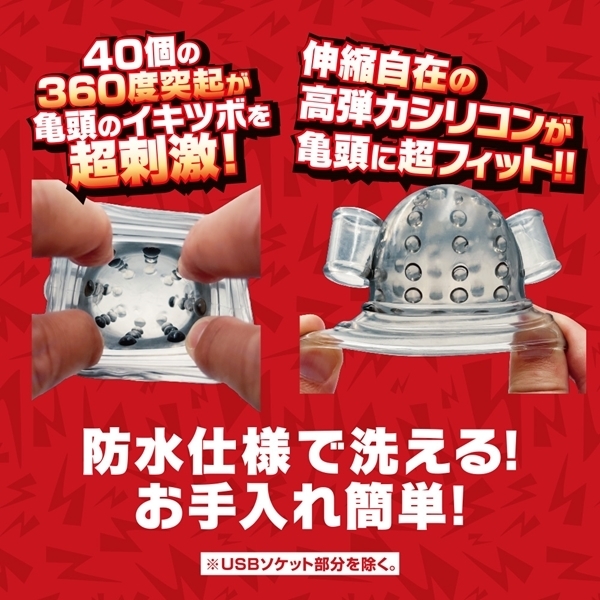 M男の欲望を満たすために設計された究極のアイテムです。 20種類の振動パターンがカリ首を的確に刺激し、ハンズフリーで楽しめる仕様!高弾力シリコンで亀頭をしっかりホールドし、内蔵された40個の突起が絶妙なイキツボを刺激します♪パワフルなツインローターで裏表からカリ首を責め立て、絶頂へと導きます!USB充電式で、ワンボタン操作が簡単便利。 防水仕様だからお手入れも簡単で、いつでも清潔に保てます♪手になじむリモコン形状で、あなたのオナ活をより一層楽しませてくれること間違いなし!