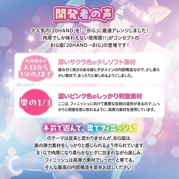 人気の20HANDをベースに、大きなサイズでリッチな使用感を追求した非貫通オナホールです♪「肉厚でしか味わえない使用感」をコンセプトに設計され、高弾力素材による包まれる感触とまったり楽しめる内部構造を実現しています!入口部分は丸く使いやすく、薄いサクラ色の柔らかい素材が3分の2までのエリアを包み込んでいます♪絡みつく縦ヒダがメインの構造で、柔らかい触感を楽しむことができます!奥の部分には、濃いピンク色のしっかりとした刺激素材を採用し、フィニッシュに向けての役割を強化♪「手前で遊んで、奥でフィニッシュ」というテーマは従来のモデルと同じながら、このBIG版では奥の弾力をより深く感じられる設計です!日本製の高品質で、特別なリフレッシュタイムを提供します♪