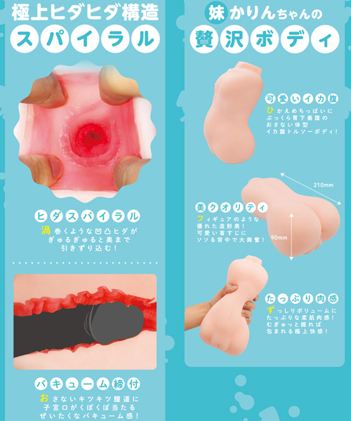 むっちりな妹にもっちり包まる!重量級の肉厚オナホ「いかばらしすたーず」!ぽっこり胃下垂なおさないボディといえば「いかばら」。 その「いかばら」をイメージさせる肉厚腹×キツ締付のオナホールです!だらしないその肉付きがとっても可愛くてたまらない!むっちりもっちりな柔肌に包まれるこの肉快感!肉厚と相性の良いキツ締め内部構造!ずっしりボリュームと搾り取れる内造形にもうヤミツキ!「妹 かりんちゃん」は、まさにタイトルそのままのようないかばらトルソーボディ!見ても良し触っても良し挿れても良しで大興奮!ひかえめちっぱいにぷっくら胃下垂腹、可愛い首筋やソソる背中と、フィギュアのような美クオリティ!重さもずっしり1050グラム!片手じゃ溢れちゃうから両手で大切に持ち上げてネ♪内部構造は最深部に子宮口もあるリアルシミュレートタイプ!渦巻くようにぎゅるぎゅる締め付け&絡み付け刺激にクポクポあたる贅沢な子宮口!スパイラルな凹凸ヒダが最深部まで導いて、おさないキツキツ膣道によるバキューム感!極上ヒダヒダ構造のスパイラル!可愛い姉妹を、たっぷり愛してね♪ミニローション付き