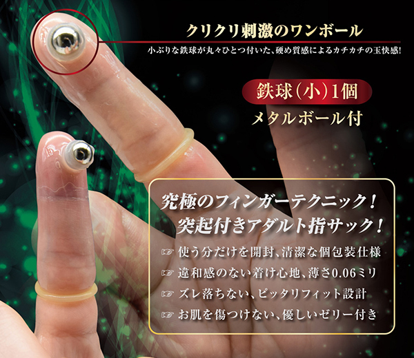 普通の指挿入だけでは物足りない!そういうときに役立つのが「フィンガースキンDX (G−6)」。 コリコリとした刺激が味わえるメタルボールが指先についたラブグッズ版の指サック!コリコリ、トントンとこれまでの指挿入では味わえない刺激が楽しめるほか、Gスポットやアナルに挿入して前立腺を刺激するなど男女兼用でお楽しみ頂けます♪鉄球はしっかり台座に固定されているので簡単に外れるような心配は不要!使うことで心地良い異物感が味わえるので細めのローターやディルドに被せて使うのも◎。 表面にはゼリーが塗布されていて挿入しやすく衛生的♪気持ちいいところをピンポイントで刺激するのに最適です!