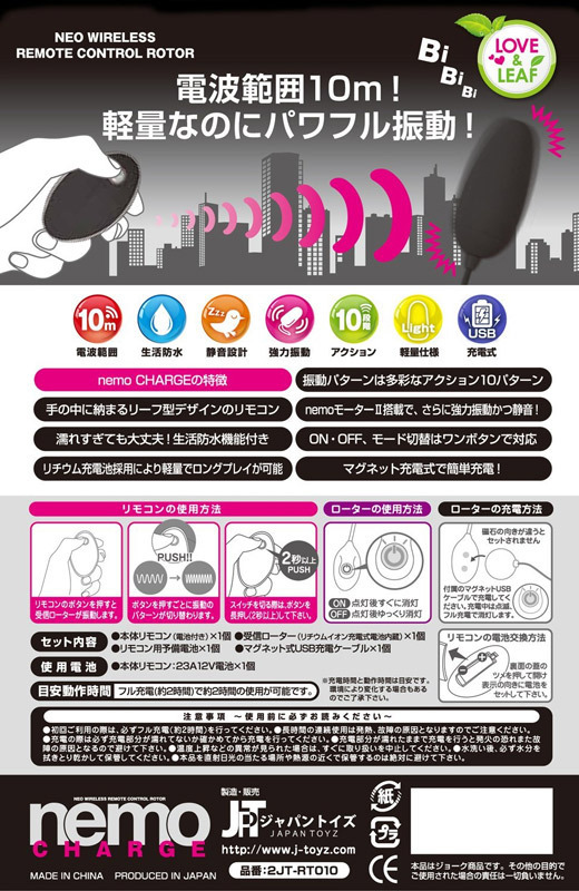 ドキドキの羞恥プレイを体験!離れた場所から振動を操るブラックカラーのワイヤレスローター。 ●便利なUSB充電式●手の中に収まるリーフ型リモコン●約10mの距離まで遠隔操作可能●多彩な10種類の振動を搭載●電源ON/OFF&振動切替え・ワンタッチボタンで対応●ON→点灯後すぐ消灯・OFF→点灯後ゆっくり消灯●静音設計&生活防水仕様●2時間充電で約120分の連続稼働。 リチウム電池採用により軽量でロングプレイが可能に…!いつでもどこでもイタズラし放題!S心を疼かせるリモコンローターです。