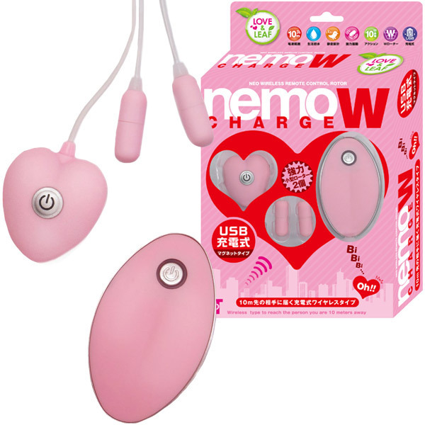 遠隔操作で楽しむキュートなリモコンローター「nemo」シリーズの小型ダブルローター。 ●肌触りの良いピンクマット加工●手に馴染むリーフ型リモコン●ハート型の受信機付きツインローター●受信の最大距離は約10m●小型でも強力な10パターンの振動搭載●ワンボタンでON・OFF・振動切替可●便利なマグネット式USB充電ケーブル付属●約2時間のフル充電で約1時間稼動(受信機)●ローター部分のみ水洗い可。 強力ワイヤレスの遠隔ローターシリーズ「nemo」に、ピンポイントで当てやすい小型のツインロータータイプが登場!両乳首やクリ&膣の同時責めなど、幅広いプレイスタイルに対応可能です。 受信機は振動時以外も電波受信の為に電池を消費しますので、使用後は必ず電源をOFFにしてください。